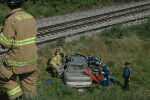 Car careens over embankment