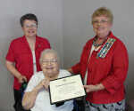 Clara Lyons, center, received her Daughters of the American Revolution membership certificate and pen from Elizabeth Carey Chapter DAR Regent Betty Garton, during an induction ceremony recently held at Medical Lodge of Fort Scott where Mrs. Lyons lives... -