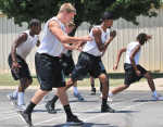 Fort Scott Community College defensive backs were out in the heat Friday afternoon doing conditioning drills. The Greyhounds open their season at home at 7 p.m. Aug. 25 with Blinn (Texas) College. (Michael Pommier/Tribune)