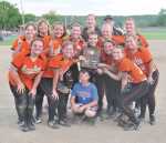 Uniontown High School's softball team poses with the Regional championship plaque after beating Yates Center in the finals, 10-4, at Uniontown Thursday night, earning the program's first trip to the State Tournament. Members of the team are (from left): Front: Taylor Cooper, Haley Felt, manager Hathaway, Jamie Dawson (holding the plaque), Lakyn Coyan, Amber Bartlett, and Jackie Duvall; Back: Brittany Tanner, head coach Paula Coyan, Mandie Ridge, Torrie Hathaway, Emily Shinn, coach Willie Hathaway, Brit Stokes, and Taylor Wade.. ... -
