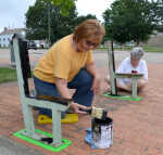 Loretta George/Tribune photo Members of Pioneer Kiwanis help refurbish the park benches at Skubitz Plaza on Wednesday morning. Dona Bauer, left, and Jeanne Randles scraped and then painted frames on ten benches. The City of Fort Scott later placed new treated boards to the frame. Bauer noticed the benches were in need of repainting and approached the Pioneer Kiwanis and the city about providing this community service. The city supplied the paint and brushes... -