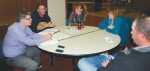 Bob Beckham, second from left, Fort Scott High School principal, and Bob Garner (right), vice president and market manager of Landmark National Bank, discuss various aspects of the Workforce Development Group's peer mentoring program with the parents of students who have signed up to be mentored. The discussion took place Wednesday evening at the Fort Scott High School commons... -