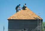 Employees of Wilson Home Restoration of Pleasant Hill, Mo., finish replacing the Western Blockhouse roof with wood cedar shingles Friday afternoon. The roof was damaged during the April 2013 hailstorm. Fort Scott resident Gene Duvall said the Civil War era building was constructed in 1863. ... -