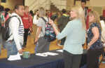 Jason E. Silvers/Tribune photo Fort Scott High School student Kevin Miller visits with Stacy Dwyer and Pam Guilfoyle representing Cobalt Medplans about the local company during the Career Day event Friday at the high school. The event, hosted by the Young Professionals League of Bourbon County, is designed to help FSHS students identify potential career paths and meet with professionals in the community. About 30-40 professionals representing several career fields attended the event... -