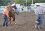 Tripp Mathes of Iola dismounts from his horse, Rocket, during the goat tying competition of the Southeast Kansas Timed Event Circuit held Thursday evening at the Bourbon County Fair.