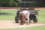 Christian Tavernaro, who is on the field crew for the Fort Scott Recreation Department, pulls up second base as he works on the infield at Third Street Park Tuesday afternoon.