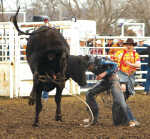 Dalton Sweley appears to be going head-to-head with the bull he just dismounted during the senior boys' bull riding division of the Southeast Kansas Little Britches Rodeo Saturday at the Bourbon County Fairgrounds. Sweley was not injured during the ride... -