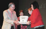 Jason E. Silvers/Tribune photo Local businessman Steve Buerge, left, and his wife Elaine, accept the 2015 Keystone Award from Fort Scott Area Chamber of Commerce board member Reta Baker and FSACC Executive Director Lindsay Madison during the chamber's annual dinner and awards celebration Thursday night at the Liberty Theatre. ... -