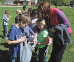 Winfield Scott teacher Linda Rogers helps students in her second grade class look through bags of trash they collected on the school grounds in observance of Earth Day on Wednesday. During the project, students with plastic bags broke into groups and then reported back to Rogers with their findings... -