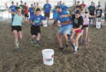 After a week of serious fair competition, participants race toward a bucket filled with water and whiffle balls during a game that was part of the Barnyard Olympics Friday afternoon at the Bourbon County Fair. The game involved contestants using spoons to fish the balls out of the water, then racing back to their team with a goal of collecting the most balls for their team. The fair concludes today with the garden tractor pull at 6 p.m...