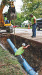 Russell Cornett uses a trackhoe excavator to lower a 12-inch waterline into a dug hole on 12th and National Avenue Friday afternoon. Gene Brown, center, makes sure the pipe aligns correctly as Mark Miller watches. The workers are from Amino Brothers Company, Inc., of Kansas City, Kan... -
