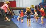 Instructors Brandi Shipley, left, and Gracie Krokroskia help a group of gymnastics students at Fort Scott's Buck Run Community Center perform various jumps during an evening gymnastics class Tuesday. -
