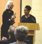 Genevieve Young, left, receives the 2015 Gordon Parks Choice of Weapons Award Saturday during the 12th Annual Gordon Parks Celebration at Fort Scott Community College. Presenting the award for the Gordon Parks Museum is Leslie Parks, Gordon Parks' daughter... -