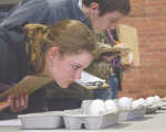 Chapman High School junior Kati Fellman studies an egg Friday during the Exterior Egg Quality contest in the Fort Scott Community College east campus building. Feldman and other students judged eggs based upon looks, cracks, veins, and general defects. The contest, along with many others, were part of Fort Scott Community College's 40th Annual Agriculture Interscholastic Contests, or "Aggie Day," for area 4-H and FFA chapter students... -