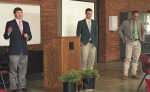 Chase Gleason of Uniontown left, talks about the choice he made to attend a college close to home, which has been ranked number one academically in the nation. Also pictured are his Fort Scott Community College livestock judging teammate Callahan Grund of Sharon Springs and coach Ryan Page. A reception to honor the team, which has completed the year as national champions, was held Friday after on the FSCC East Campus... -