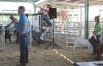 A seller and her goat wait their turn as Auctioneer Lonnie Stripe of Humeston, Iowa, upper right, sells a goat being shown in the ring. Ron Dilley of Stillwater, Okla., upper left, was also an auctioneer for the sale. This is the first year the sale, which is in its third year under the Heartland name, has been held in Fort Scott. In past year, the sale was held in Oswego. Buyers and sellers were from Missouri, Oklahoma, Iowa and Kansas. About 105 goats were expected to go through the ring... -