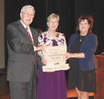 Dick and Jan Hedges accept the Keystone Award from Chamber of Commerce Executive Director Lindsay Madison. The Hedgeses received the award for their years of service to the community. The award was presented during the Chamber's Annual Dinner and Awards Celebration held Thursday evening at Liberty Threatre. Madison said attendance was at a record high of 206 people. See more photos in next week's Tribune... -