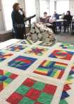 Earline Foster talks to her neighbors at Presbyterian Manor about the quilts she has made. She was assisted Friday afternoon by her son, Steven Wulz of Texas, and Judy Davis, Presbyterian Manor staff. -