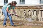 Gabrielle Allen of Fort Scott power washes the rock wall and sign at the Fort Scott National Historic Site Friday afternoon. Allen is a Fort Scott Community College graduate, and a newly hired laborer at the fort. -
