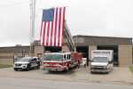 A large U.S. flag hangs off the ladder of a Fort Scott fire truck, which is parked next to a Fort Scott Police Department squad car and Bourbon County EMS ambulance in recognition of Patriot Day on Friday. Patriot Day is held each year in remembrance of the 2,977 people killed in the Sept. ...